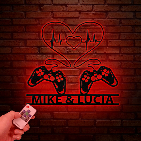 Personalized Gaming Couple Metal Sign with LED Light, Heart Game Controller, Custom Name Wall Art, Gifts for Couples, Game Room Decor
